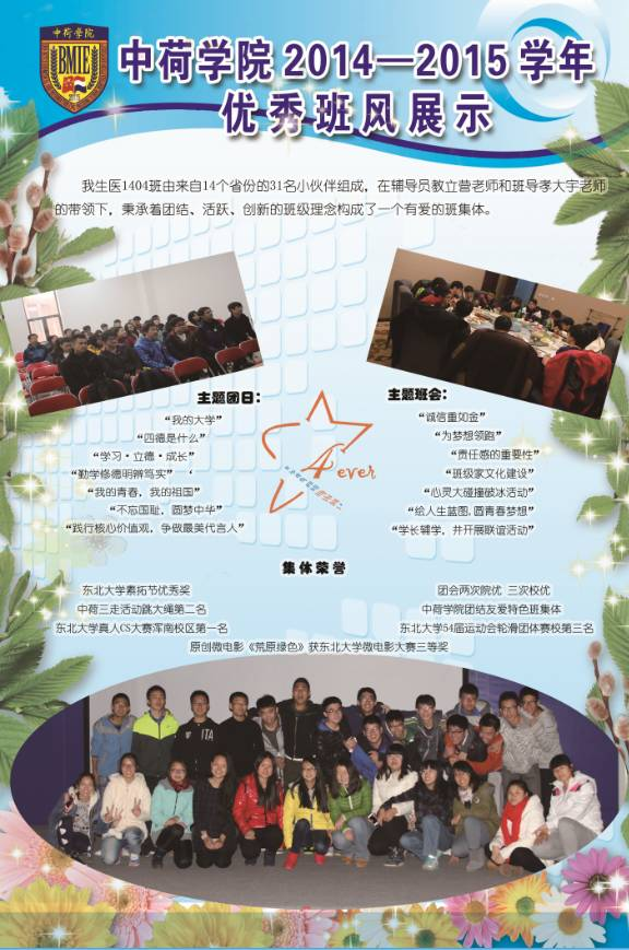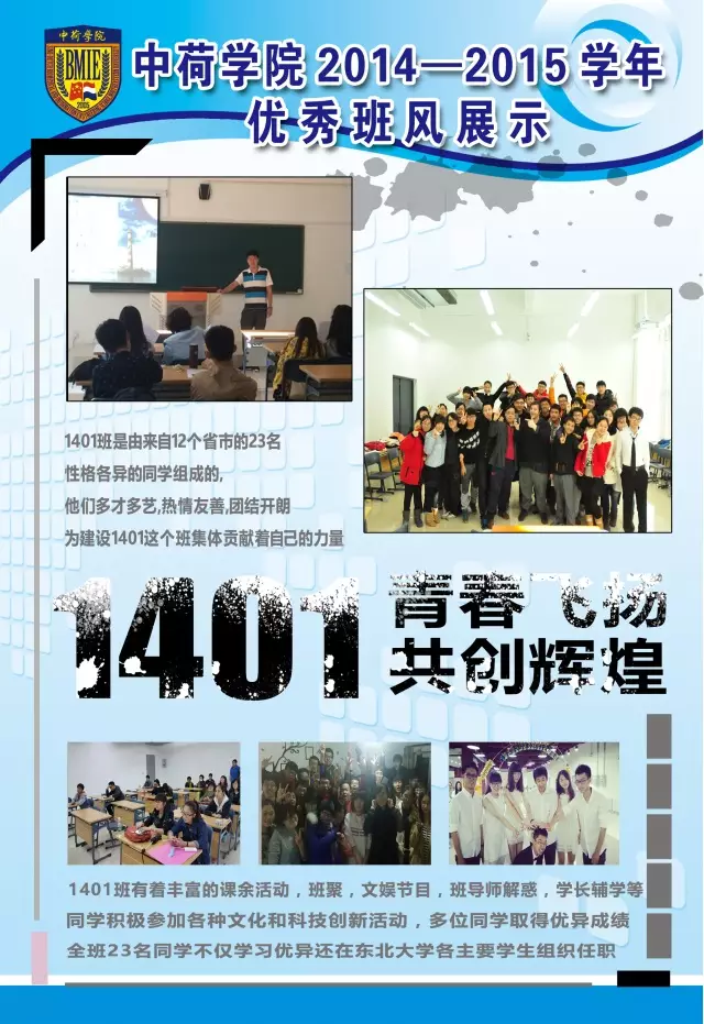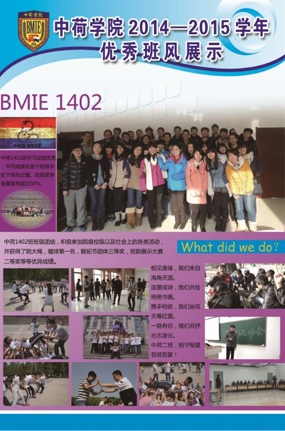 (通讯员 程俊龙)2015年11月—12月,中荷学院开展2014—2015学年先进班集体建设工作,并成功举办2014-2015学年先进班集体和特色班集体答辩会。在此基础上,为进一步巩固我院班集体建设成果,展示校院两级先进班级体优良班风,带动我院班集体向上发展,现将各班优秀班风进行展示。