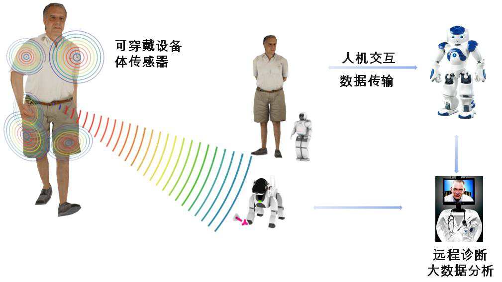 人口老龄化问题是目前中国社会面临的一项严重挑战,空巢老人问题和各种慢性心脑血管疾病都严重影响老人晚年生活质量。通过引入可穿戴体传感器,监测老人的生理和心理状态,通过各种网络传输到社区中心或者医疗中心,通过数据监测和分析来实时了解老人的状态,通过引入人形机器人可以达到”机器人保姆”的效果,通过人机交互、远程数据传输、机器人的移动性和智能性,可以帮助老人缓解孤独感,提高生活质量。