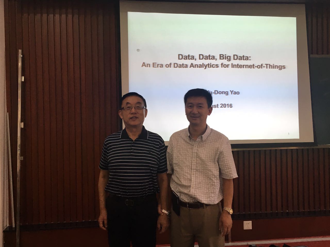 2016年8月15日上午10点,受东北大学流程工业综合自动化国家重点实验室柴天佑院士邀请,东北大学建筑馆自动化中心二楼会议室,姚育东教授给实验室师生们做学术报告,报告题目“Data,Data,BigData:An Era of Data Analytics for Internet-of-Things”,“物联网中大数据分析”,姚育东教授首先介绍了IEEE的相关背景、自己的专业和研究背景情况,目前在中荷学院开展的研究重点“健康物联网、健康大数据、机器学习、深度学习”。
