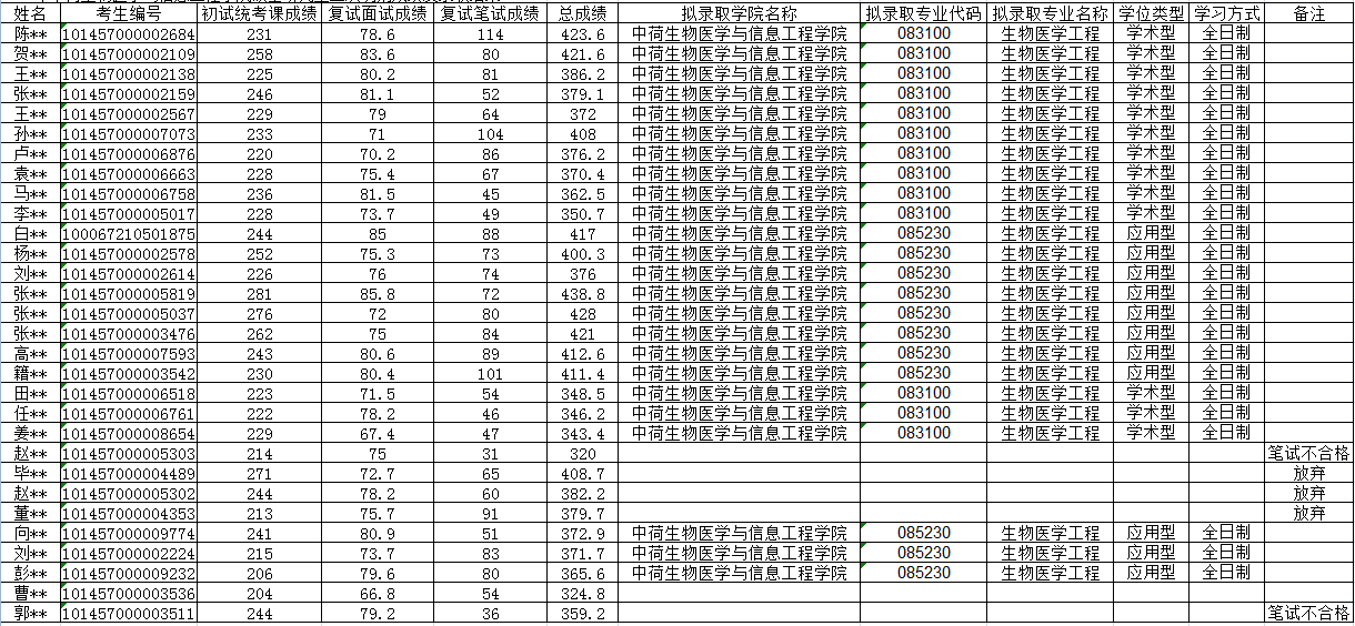 2017年中荷生物医学与信息工程学院硕士研究生二次调剂成绩及录取结果(更新)