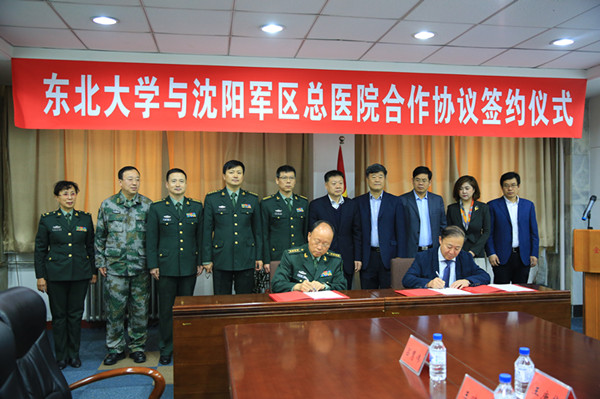 2018年4月23日上午,东北大学与沈阳军区总医院签署医学与生物信息工程学院共建协议,探索医工结合培养“新医科”拔尖创新人才的新途径。沈阳军区总医院院长侯明晓、副政委田敬革、副院长白晓忠,东北大学校长赵继、总会计师芦延华出席仪式。双方相关部门负责人参加签约仪式。