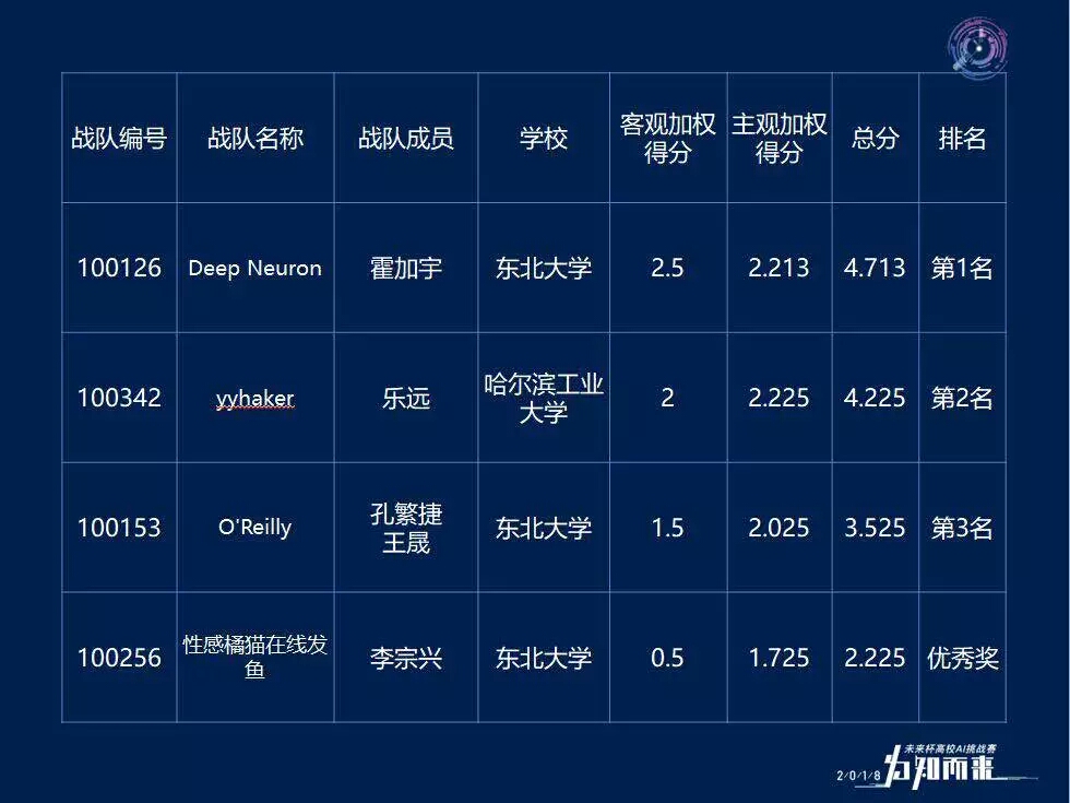 “未来杯高校AI挑战赛”图像算法组东北赛区共有四支战队进入到区域赛线下答辩环节,分别是来自东北大学的“Deep Neuron”、“O’Relly”、“性感橘猫在线发鱼”以及来自哈尔滨工业大学的“yyhaker”。
