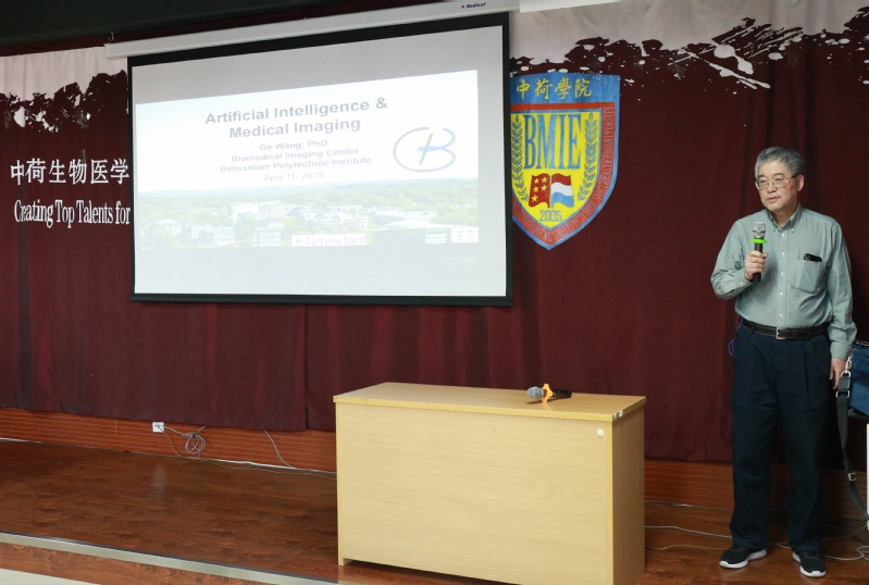 4月11日,应中荷学院钱唯院长邀请,美国伦斯勒理工学院(Rensselaer Polytechnic Institute, RPI)生物医学影像中心主任王戈教授访问东北大学,在浑南校区生命学馆B619报告厅,进行了题为“用于医学成像的人工智能-Artificial Intelligence for Medical Imaging”的学术报告。