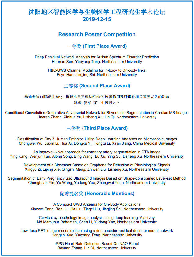 姚育东院士主持会议,齐守良副教授做了题为“Lung Imaging:Will AI Make Us Smarter”的学术报告。姚育东院士做了题为“研究与学术论文写作”的主题报告,向同学们介绍了学术研究的方法与一些雷区。会议第二项内容为三所大学研究生分别展示制作的Poster海报,以竞赛形式讲解自己对“智能医学与生物医学工程”的认知。经过大家评选投票,最终产生了2个一等奖,2个二等奖,4个三等奖以及4个优秀提名奖。