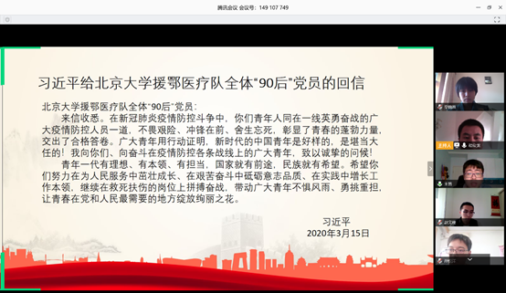 首先,程俊龙带领全体学生党员一同学习第一季度“两学一做”主题教育内容,集体观看了视频短片《习近平讲述的故事|雷锋,永恒的精神坐标》,学习传承雷锋精神,教育全体党员守初心、担使命。党支部结合现阶段疫情防控工作实际,集体再次深入学习《习近平给在首钢医院实习的西藏大学医学院学生的回信》和《习近平给北京大学援鄂医疗队全体“90后”党员的回信》内容,全体党员认真聆听,热议回信内容。