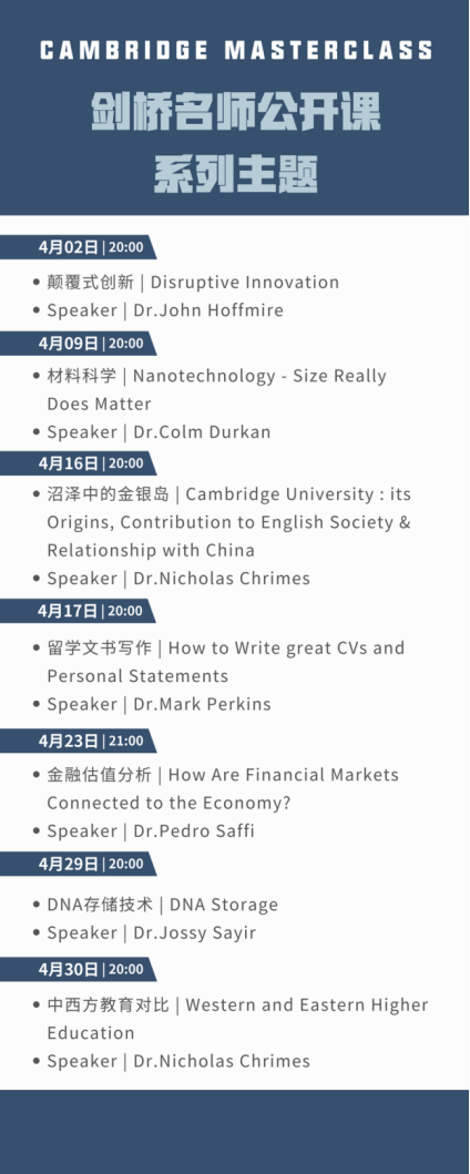 文明遐迩的三一学院、机巧的数学桥、浪漫的老鹰酒吧、古老的叹息桥、神奇的苹果树,810年来剑桥大学以其深厚的历史人文、卓越的学术成就、著名的大师学者成为世界莘莘学子朝拜的圣地,求学的最高殿堂。为引进国际卓越学术资源,打造国际化办学特色,满足医工学院全体师生向世界最高学府孜孜以求的愿望,2019年8月起,学院秉承科学与人文并重的思想开启与英国剑桥大学的合作之路,经过为期半年的努力,首期剑桥名师大讲堂将在2020年4月2日晚20:00点整正式开启。首期大讲堂邀请了剑桥大学七位不同领域的专家学者通过线上直播的方式与我院全体师生对话,剑桥大学的知名教授将与师生共同探讨理工、历史、商业、科技等不同学科领域的热点话题、前沿研究、职业发展等精彩内容,让师生在线上也可以拥有全球化学习、教学体验。通过线上直播的方式,全院师生有机会与名校教授面对面交流,全真体验海外名校课堂、收获专业知识、英文课程学习。