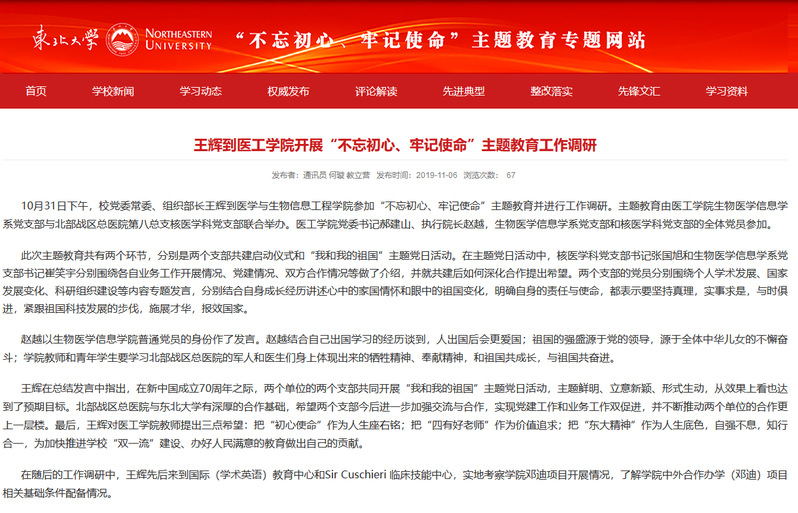 生物医学工程的专业特色是医工融合,而学院教师多数为工学背景,在教学和科研工作中有很多方面需要医生的临床经验指导。经过长时间的酝酿和筹备,东北大学与北部战区总医院共建医学与生物信息工程学院合作协议于2018年正式签订,探索医工结合培养“新医科”拔尖创新人才的新途径,以此为契机,生物医学信息学系党支部与北部战区总医院第八总支核医学科党支部先后组织4次“医工融合促发展”系列主题党日活动。双方立足于合作共赢的出发点,将党建工作与科研合作融合,既可以调动支部党员参加党日活动的积极性,同时也吸引了很多系内非党员教师参加。