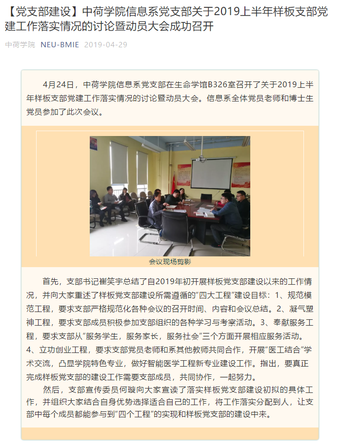 医学与生物信息工程学院生物医学信息学系党支部于2019入选东北大学特色支部创建工作名单。从建设初期开始,支部全体党员坚持以习近平新时代中国特色社会主义思想为指导,以落实“立德树人”根本任务和助力学校一流大学建设工作为己任。为了适应学校党的基层组织建设面临的新形势和新任务,党支部在党建工作和党日活动中不断探索新方法、总结新经验,逐渐归纳出“一条主线,四项工程”的支部党建特有模式。“一条主线”指党建活动内容坚持紧密围绕生物医学工程的专业特色,围绕医工融合发展的核心主题开展;“四项工程”指在规划具体活动时,分别从规范模范工程、凝心塑神工程、奉献服务工程和立功创业工程这四个层面落实。先后组织了“医工融合促发展”、“医工知识扶贫”等系列活动,逐渐形成了组织生活常态化、规范化,党员思想坚定化、统一化,组织活动多样化、创新化,建设成效鲜明化、实质化的支部建设特点。