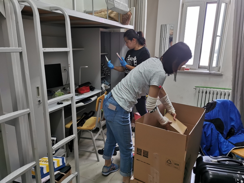 为保障不返校毕业生行李能够顺利、快速、安全到达毕业生手中,学生工作办公室在前期制订了周密的实施方案,从授权委托、行李打包、快递邮寄每个环节确保严谨细致,为毕业生送去最贴心的行李打包邮寄方案。学院教工两人一组,到达寝室后,首先与毕业生进行视频连线,在视频指导下找出贵重物品,然后分类整理毕业生的所需物品,进行细致打包,打包结束后与毕业生再次确认打包物品和行李件数,确认无误后进行封箱。最后,辅导员指导快递员完成行李的邮寄工作。