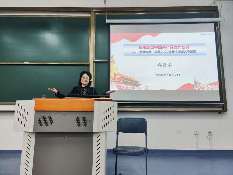 10月21日,医工学院2020级新生入党启蒙教育报告会于生命学馆B101举行。原东北大学思想政治理论课教授、现任东北大学马克思主义学院关工委常务副主任邱秀华受邀作专题报告,医工学院党委副书记王帅、学生工作办公室主任程俊龙出席会议,会议由2020级新生辅导员杨雨錚主持。
