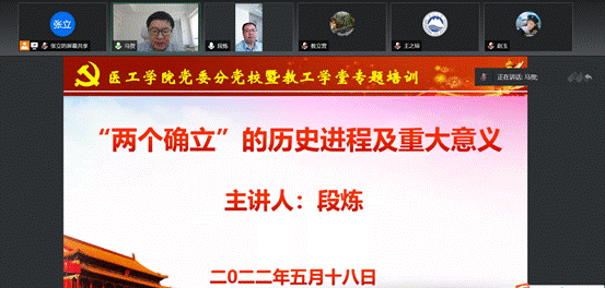 近日,医工学院党委分党校、教工学堂联合举行专题培训,学习党的十九届六中全会精神。马克思主义学院中国近现代史研究所所长、学校理论武装宣讲团成员段炼副教授应邀做专题报告。学院全体教职工和学生党员参会。