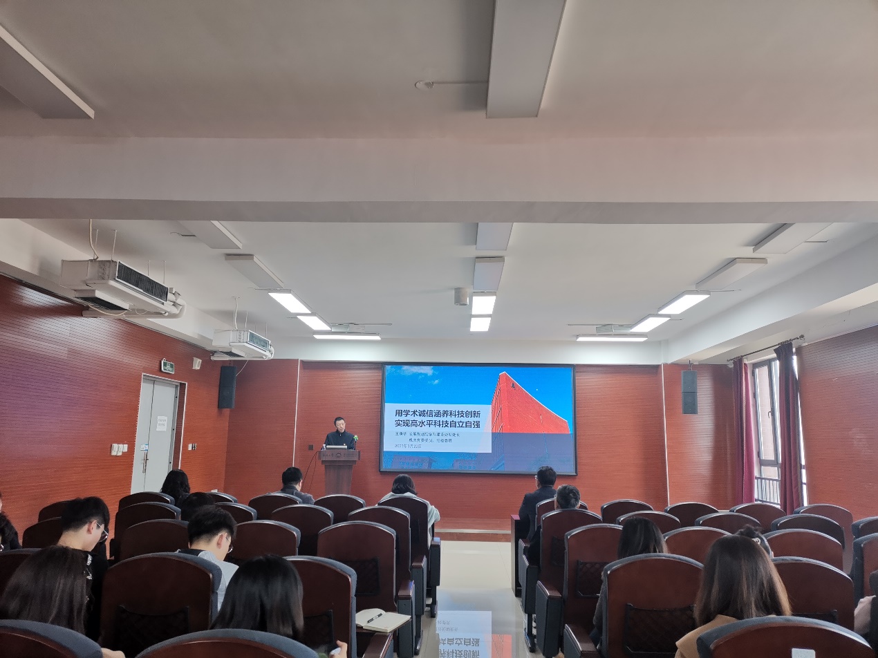 会议邀请学校发展规划与学科建设处副处长、机关党委委员、纪检委员王庚华作题为“用学术诚信涵养科技创新实现高水平科技自立自强”的专题报告,他从“学术共同体与科学共同体”、“学术不端行为的界定”等方面作出详细阐述。王庚华以案说法、以案说纪,强调了党中央对科研诚信建设的高度重视与构建完善的学术诚信体系的决心,并提出与学术工作者共勉:学术工作者应当不慕虚荣、不计名利;对科研要有好奇心,坚韧勇敢;要始终把国家和人民放在心上。