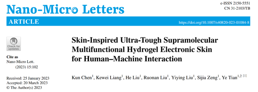 近日,东北大学医学与生物信息工程学院田野课题组在水凝胶电子皮肤领域取得重要突破,相关工作以“Skin-inspired ultra-tough supramolecular multifunctional hydrogel electronic skin for human-machine interaction”为题发表在国际知名期刊《Nano-Micro Letters》(影响因子23.655)上。文章第一作者是东北大学医学与生物信息工程学院硕士研究生陈坤,通讯作者为东北大学医学与生物信息工程学院田野副教授,通讯单位为东北大学医学与生物信息工程学院。