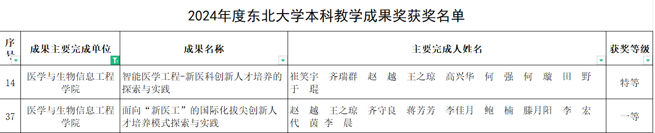 根据《关于开展东北大学2024年度本科教学成果奖评选工作的通知》(东大教字〔2024〕16 号)和《东北大学本科教学成果奖评审与奖励办法》(东大教字〔2021〕76 号)等文件精神,按照学校要求,学院积极开展了2024年度本科教学成果奖评选工作。经成果负责人申报、学院推荐、学校资格审查、专家评审及公示,我院《智能医学工程-新医科创新人才培养的探索与实践》(成果完成人:崔笑宇、齐瑞群、赵越、王之琼、高兴华、何强、何璇、田野、于琨)成功申获东北大学2024年度本科教学成果奖特等奖。《面向“新医工”的国际化拔尖创新人才培养模式探索与实践》(成果完成人:赵越、王之琼、齐守良、蒋芳芳、李佳月、鲍楠、滕月阳、李宏、代茵、李晨)成功申获东北大学2024年度本科教学成果奖一等奖,祝贺各位获奖老师!