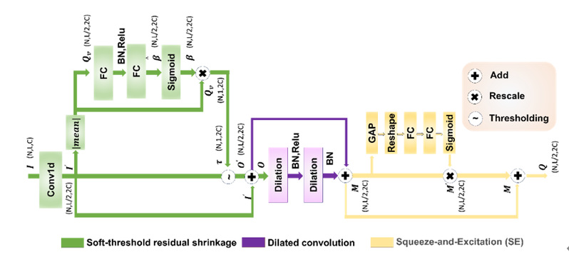 针对上述挑战,本研究深入挖掘心电数据的内在特征,提出了一种创新性的特征增强模块。该模块通过残差收缩与自适应增强机制,显著提升了模型对噪声的抵御能力,使其能够在复杂噪声环境下保持稳定的识别性能。同时,特征增强模块通过聚焦于与心房颤动相关的有效特征,减少了冗余信息的干扰,从而显著提高了模型的可解释性。这一改进不仅增强了临床医生对模型的信任度,也为心房颤动的精准诊断提供了有力支持。该成果不仅在多个权威数据库上取得了优异的性能指标,还展现了强大的抗噪声干扰能力,为临床心房颤动的自动检测提供了新的技术手段。