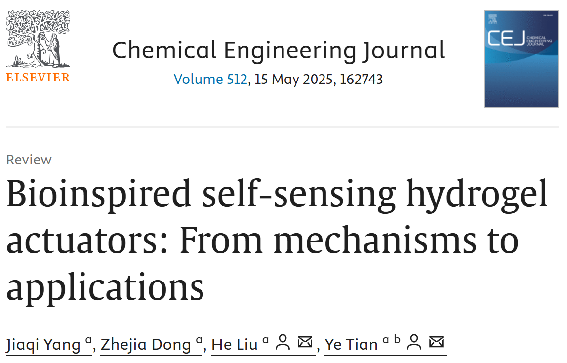 近日,东北大学医学与生物信息工程学院田野特聘研究员团队在国际著名期刊 Chemical Engineering Journal(影响因子13.4)上发表题为“Bioinspired self-sensing hydrogel actuators: From mechanisms to applications”的综述论文,系统梳理了仿生自感知水凝胶驱动器的发展现状、核心机制与未来方向。医工学院22级本科生杨佳琦为论文第一作者,刘赫博士和田野特聘研究员为本文通讯作者,东北大学为第一完成单位和唯一通讯单位。