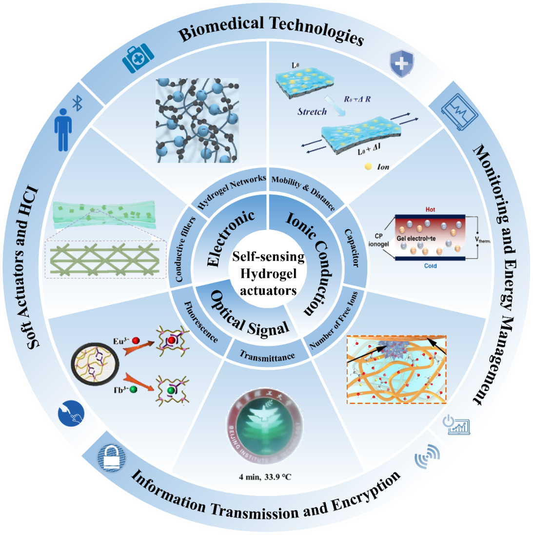 本文系统综述了仿生自感知水凝胶驱动器的研究进展:自感知水凝胶驱动器通常通过引入光热剂、导电材料、导电聚合物和自由离子来开发,并采用多种形成机制,包括各向同性(如光响应水凝胶和层状结构水凝胶)和各向异性(如重力、紫外线、纤维对齐、电场及4D打印)方法。根据不同应用需求,这些水凝胶驱动器可展现出多样的感知机制,主要包括基于电子导电的感知(如水凝胶网络与导电填料)、基于离子导电的感知(如离子迁移性、电容器与自由离子数量)以及基于光学信号的感知(如光透过率与荧光)。此外,它们的驱动策略可根据外部刺激进行分类,如光、湿度、热、电场、磁场和pH值等。自感知水凝胶驱动器具备检测自身状态及环境变化的能力,集成了感知与驱动功能,具有低能耗、灵活响应多种刺激并实现复杂变形的优势。因此,已在生物医学技术、软驱动器、人机交互(HCI)、信息传输与加密、监测和能源管理等领域取得了广泛应用。与传统外置传感器方案相比,自感知水凝胶通过其内部功能组件实现原位、实时和自主监测,为构建低复杂度、高集成度的智能系统开辟了新路径。