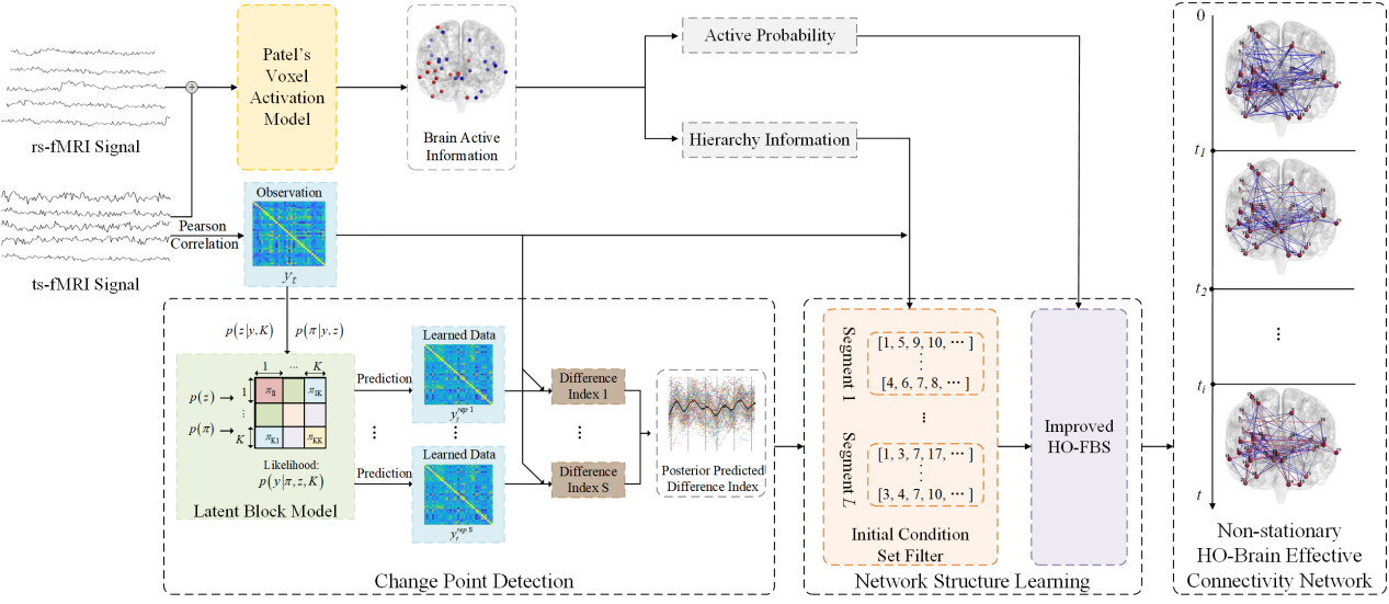 脑因效网络构建是探索脑功能机制与疾病诊断的核心课题。现有方法多基于单一假设(如平稳性或低阶特性),难以兼顾脑区信号的非平稳性与高阶动态交互特性。如何建立高精度、高效率的时变高阶脑因效网络模型,是该领域长期面临的挑战。