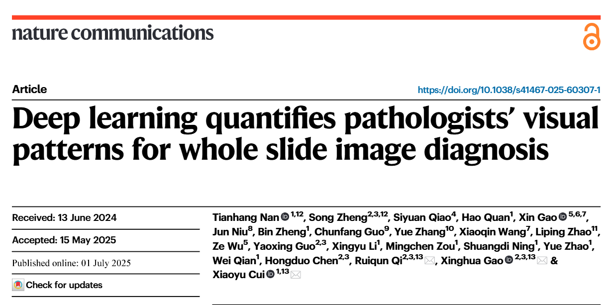 7月1日,医学与生物信息工程学院博士研究生南天航、中国医科大学附属第一医院皮肤科医生郑松为共同第一作者在《Nature Communications》发表题为“Deep learning quantifies pathologists’ visual patterns for whole slide image diagnosis”的论文。该研究由东北大学医工学院与中国医科大学附属第一医院历时5年合作完成,齐瑞群(医大一院)、高兴华(医大一院)、崔笑宇(东北大学)为共同通讯作者,东北大学为第一完成单位。